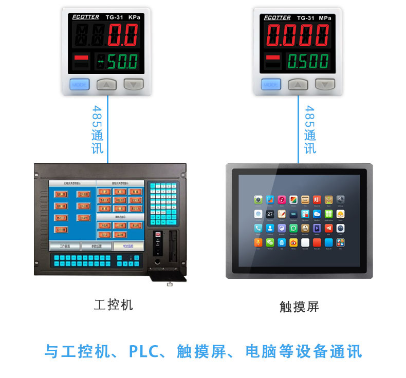 ECOTTER 通訊款485壓力開關(guān)可以傳輸氣壓數(shù)據(jù)給到系統(tǒng)進(jìn)行分析使用,可以與工控機(jī)、觸摸屏等設(shè)備互動,執(zhí)行命令、顯示數(shù)據(jù)到連接屏上。可以實現(xiàn)自動化更智能的控制及管理。