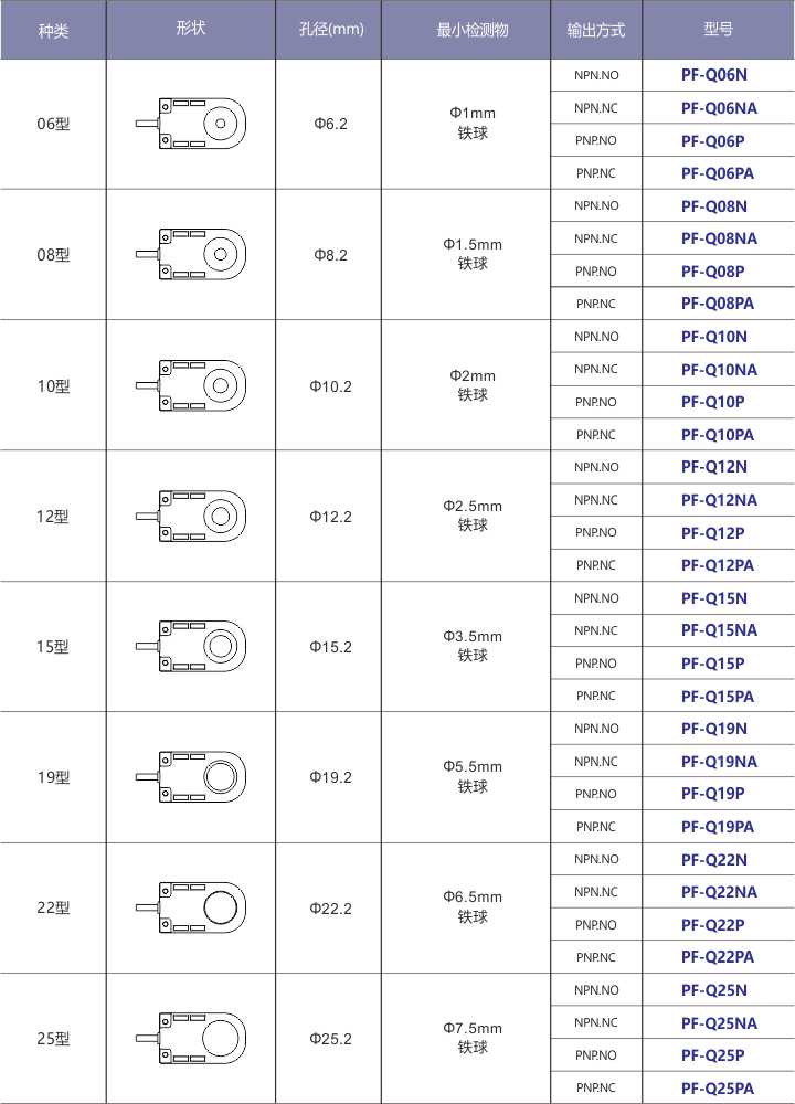 ECOTTER環(huán)型接近開關有多種規(guī)格可選,孔徑分別有6.2、8.2、10.2、12.2、15.2、19.2、22.2、25.2mm直徑,NPN\PNP開關量信號可選。