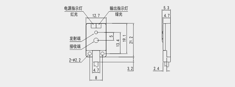 GN-045機身是21.2*12.7毫米的大小,有兩個指示燈,分別是電源指示燈紅色,上電就亮,還有一個輸出指示燈綠色。產(chǎn)品有兩個光孔,一個發(fā)射,一個接收,另有直徑2.2毫米的螺絲安裝孔,以固定位置。