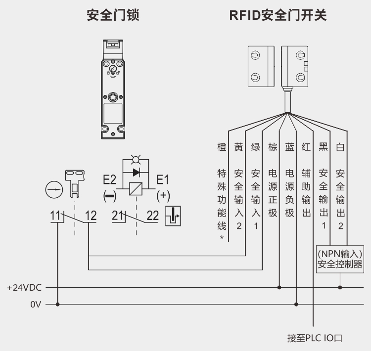 選型時,我們需要關注鑰匙控制這一項,選擇插鑰匙觸點導通的安全門鎖。然后進行接線,接線時根據非接觸安全門開關的類型,比如NPN型的,我們在安全門鎖的觸點接一邊負極,一邊接非接觸安全門開關的信號輸入線,讓鑰匙插入時觸點導通,相當于導通負極和開關的信號輸入線。下面我們通過圖來了解接線。