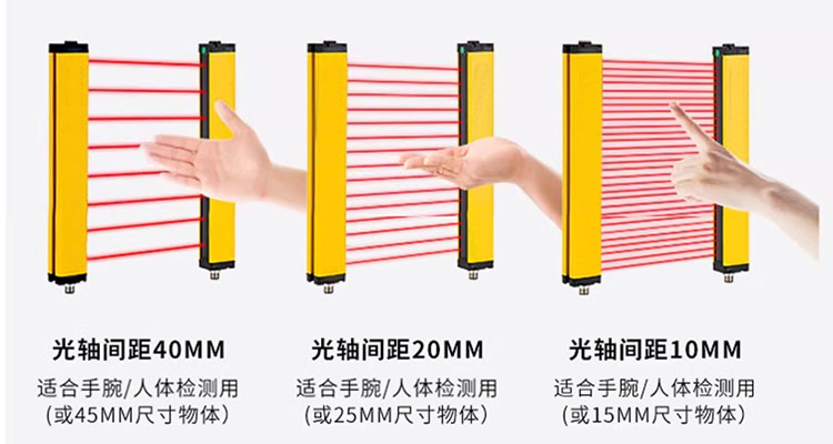 安全光幕通過(guò)不同光軸間距的選擇來(lái)決定保護(hù)的部位,光軸間距越來(lái)密集,保護(hù)的就越細(xì)致,根據(jù)光幕安裝的位置、離危險(xiǎn)設(shè)備的距離選擇適合的款式。