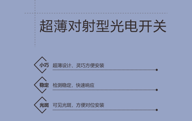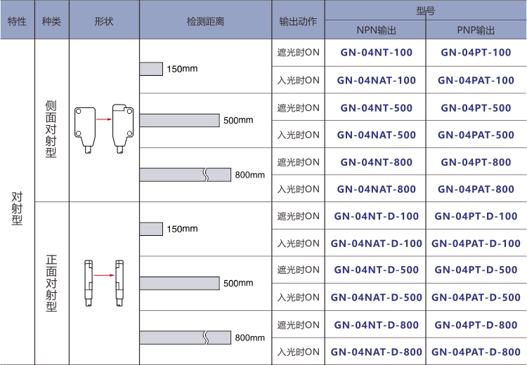 ECOTTER 超薄對射光電開關(guān) GN-04T系列 有正面對射和側(cè)面對射款,安裝距離(檢測距離)可選100mm\500mm\800mm,可根據(jù)應(yīng)用情況選擇。