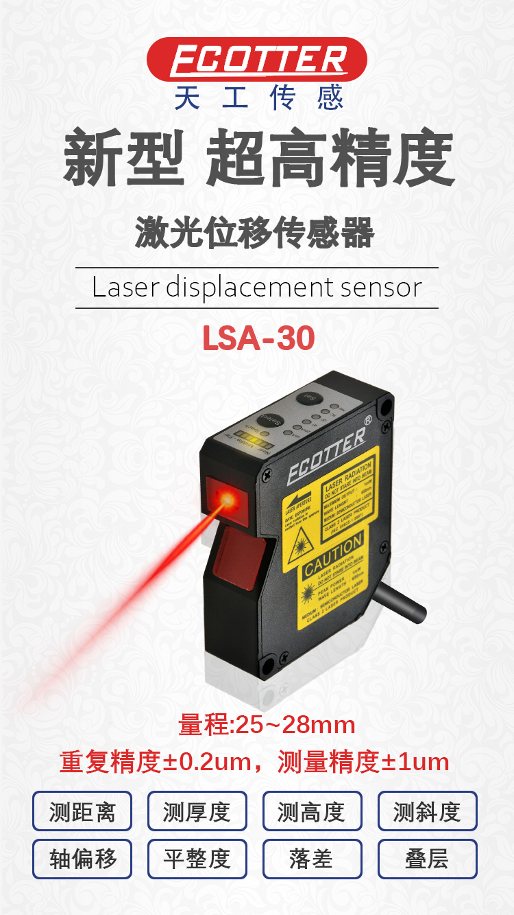 ECOTTER 新型 超高精度激光位移傳感器 LSA-30 是一種利用激光技術進行測量的傳感器,它能夠非接觸地精確測量被測物體的位置、位移等變化,LSA-30 的量程:25~28mm,重復精度:±0.2um,線性度精度:±1um。