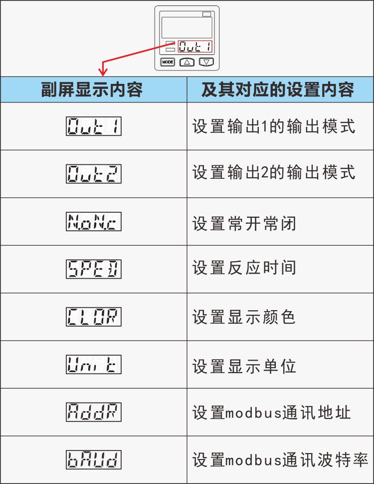 ECOTTER TG-31系列壓力表 可以設(shè)置輸出1、2的輸出模式、常開常閉、反應(yīng)時間、顯示顏色、顯示單位、通訊地址、波特率等,進(jìn)入菜單后副屏顯示設(shè)置的項(xiàng)目,主屏顯示項(xiàng)目下可設(shè)置的內(nèi)容。